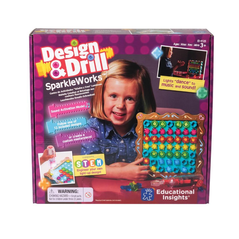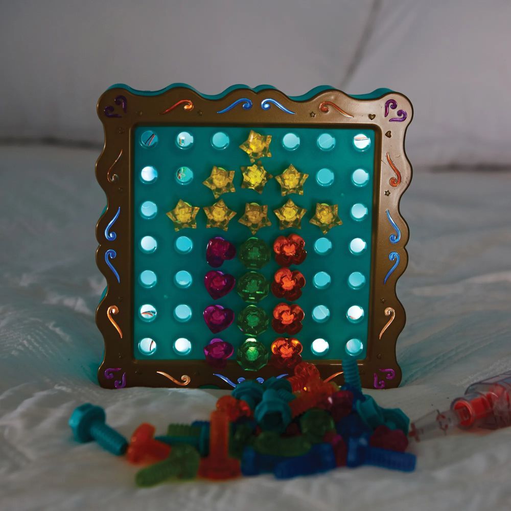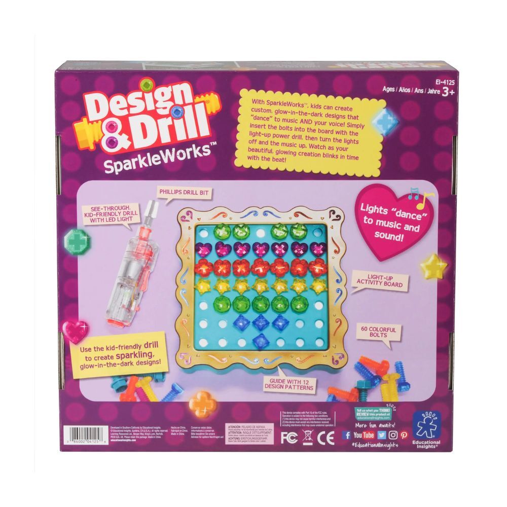 Just follow any of the 12 included patterns or create your own custom, glow-in-the-dark creations! With Sound Activation Mode, the lights respond to music or your voice! Insert one of the translucent, charm-shaped bolts into the board, then use the working, kid-friendly power drill to drill it in, and watch as your colourful creation glows from the inside!