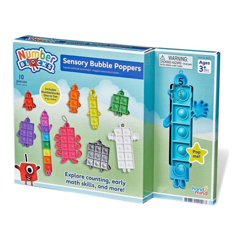 Easy to carry with attached key chains included. Includes 10 silicone bubble poppers featuring Numberblocks One to Ten.
