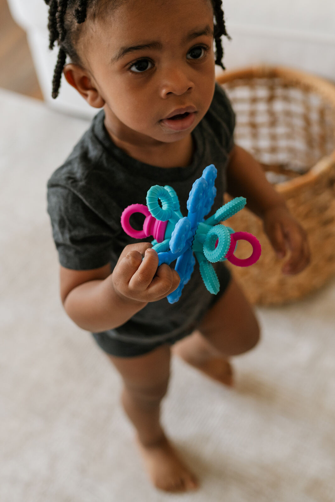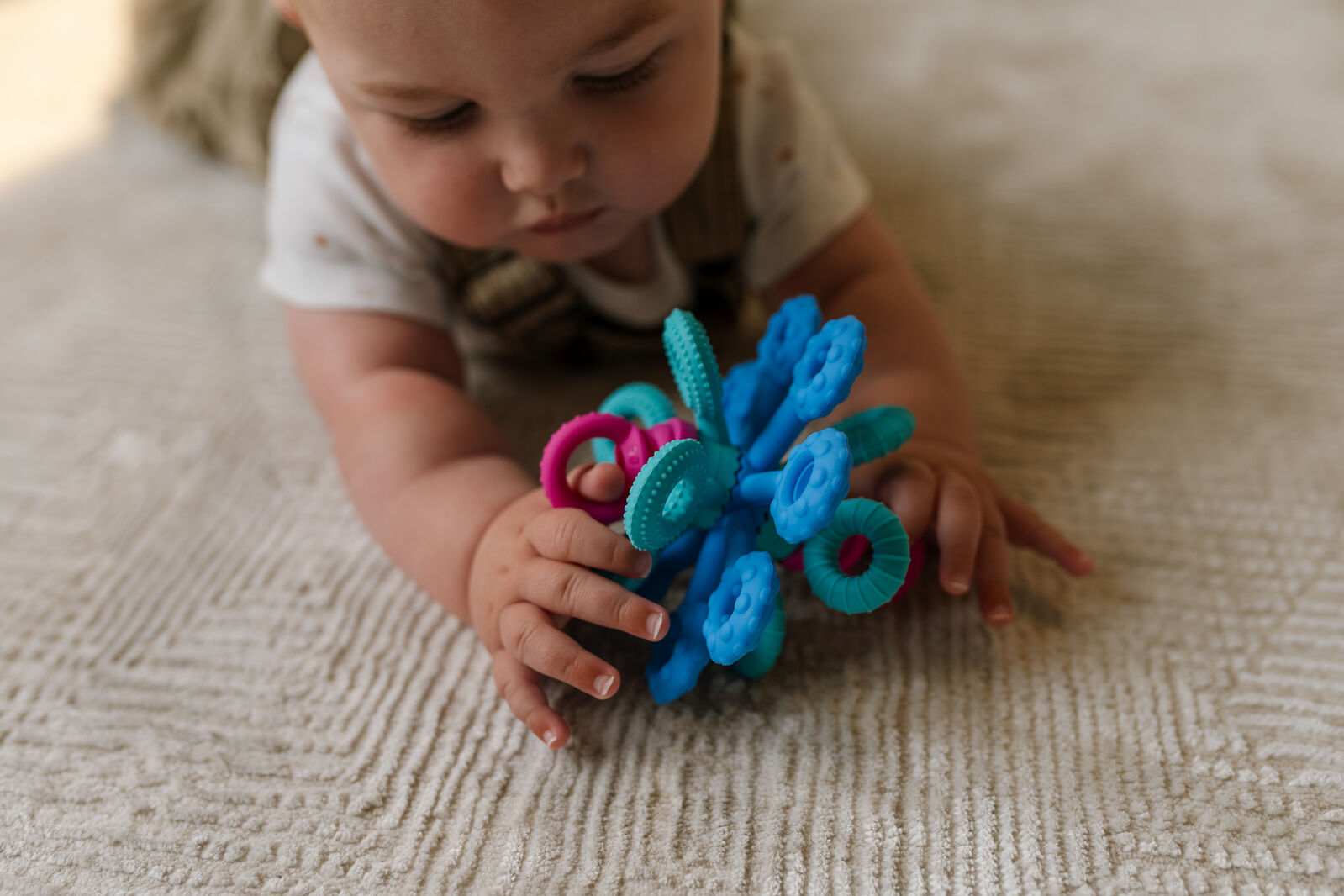 Okee Sensory Toy encourages and supports the understanding of cause and effect along with providing opportunities for sensory exploration, motor skill and cognitive development.