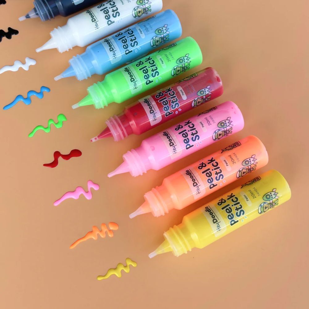 Create, peel, and stick with HeyDoodle’s Peel & Stick Solid Paints, a fun and reusable way for kids to bring their artwork to life!