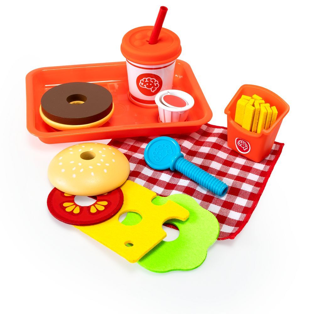 - Includes burger (2 buns, cheese, lettuce, hamburger, tomato), drink cup with lid and straw, toothpick screw, 12 felt fries, fry box, sauce cup with reversible top, tray