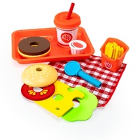 - Pretend play set featuring burger ingredients, a drink cup, and fries