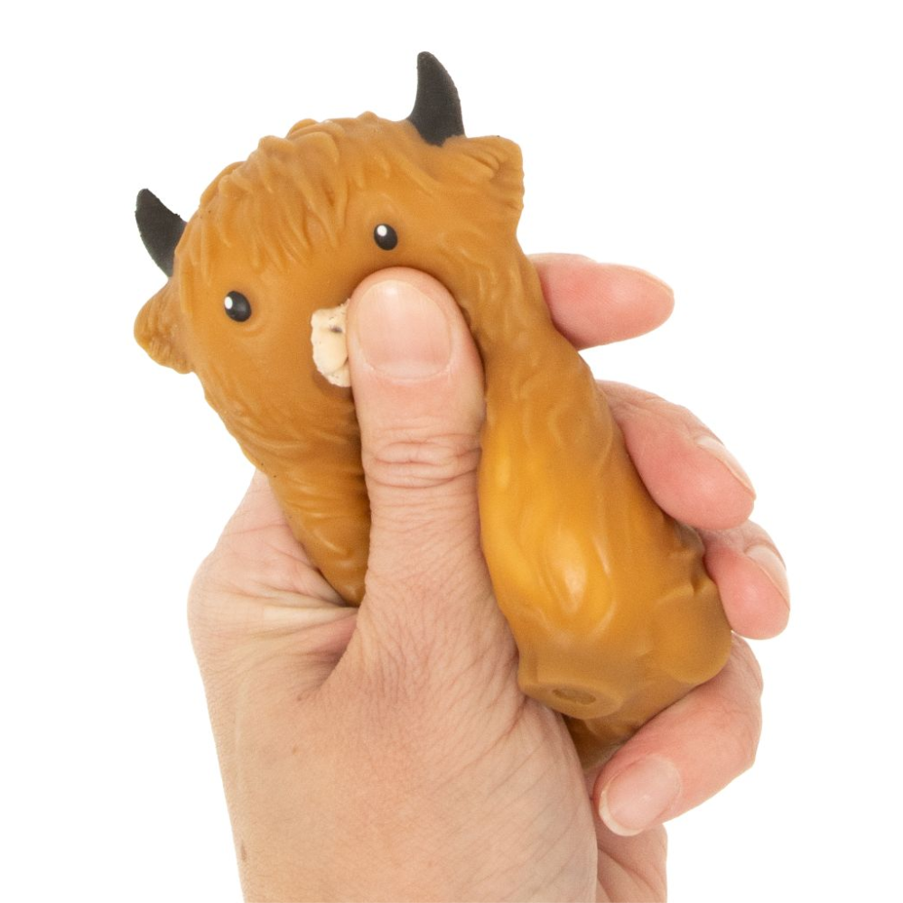 The Squishy Highland Cow is a satisfyingly soft, slow-rising toy designed for endless squeezing fun.